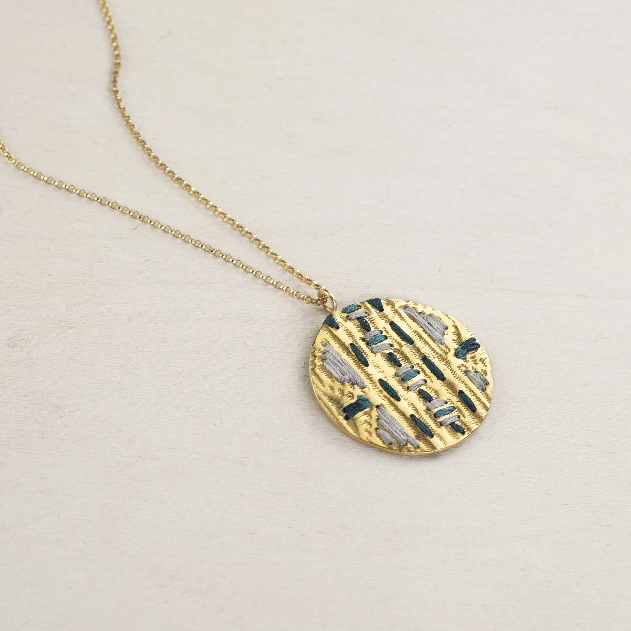 Hand-embroidering through pre-drilled points in the metal, softening the metal surface with colourful tactile patterns.